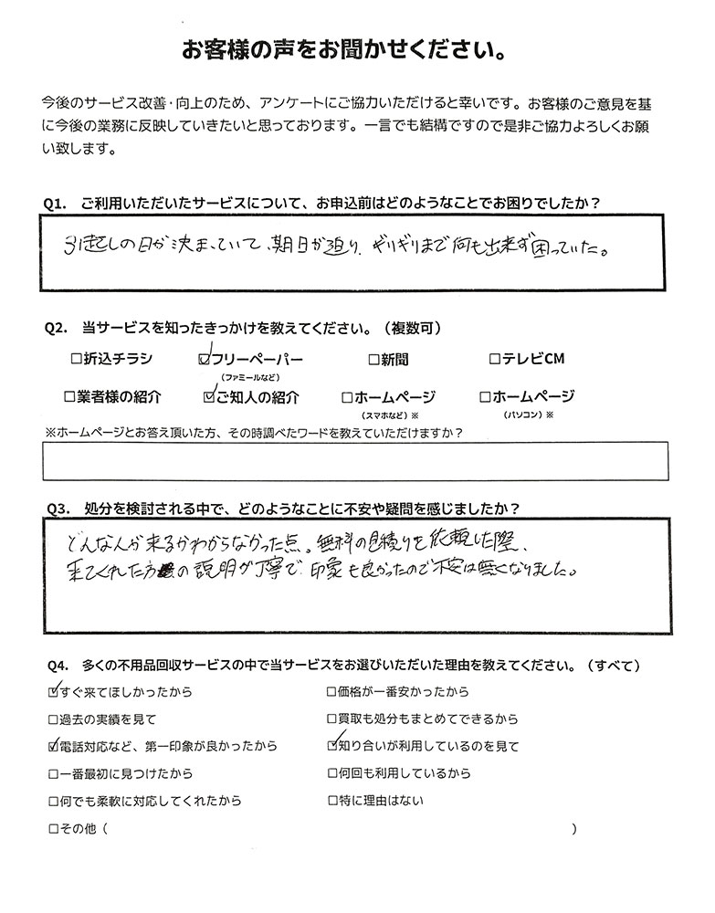 - ご遺族に迷惑をかけたくないというご要望から生まれたサービスです。ご依頼主様とスタッフが念入りに打ち合わせを行い、計画的にご家財を買取・搬出させていただきます。